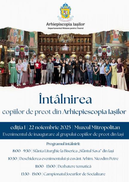 Departamentul Misiune pentru Tineret organizează în această zi, începând cu ora 8.00, evenimentul „Întâlnirea copiilor de preot din Arhiepiscopia Iașilor”. Activitățile se vor desfășura la Biserica „Sfântul Sava cel Sfințit” și la Muzeul Mitropolitan, iar invitatul întâlnirii va fi părintele arhimandrit Nicodim Petre. Evenimentul se adresează copiilor de preot din Arhiepiscopia Iașilor care studiază în municipiul Iași și reprezintă întâlnirea de inaugurare a grupului dedicat acestora.